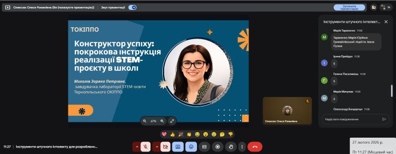 27 лютого 2026 року, відповідно до плану роботи Тернопільського ОКІППО, методистами лабораторії STEM-освіти для педагогів ЗЗСО проведено тренінг «Інструменти штучного інтелекту для розроблення учнівських STEM-проєктів».
