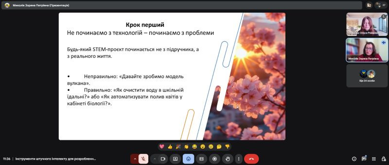 Олеся Романівна Олексюк, висвітлила тему: «Використання генеративного ШІ для проектування учнівських STEM-проєктів» акцентувала увагу учасників на важливості формування навичок дослідницької діяльності. Основна ідея полягала в тому, що генеративний штучний інтелект (Generative AI) сьогодні є потужним асистентом, що дозволяє реалізовувати складні STEM-ідеї за короткий час. Учасники отримали рекомендації та готові шаблони промптів (запитів), які допомагають автоматизувати проєктування учнівських STEM-проєктів.