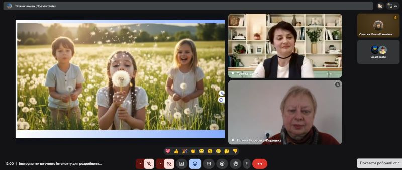 Тетяна Мирославівна Іванко, методистка лабораторії STEM-освіти, продемонструвала власні мультимедійні проєкти, створені за мотивами оповідок Г. Р. Гузовської-Корицької («Кульбаба: дід чи баба?», «Суниця й полуниця», «Зозулька»). Доповідачка детально описала етапи роботи з платформами Google Gemini, Kling AI, Hailuo AI та CapCut: від генерації й анімації зображень до монтажу, синхронізації аудіосупроводу та фінального оформлення. Представлений досвід засвідчив високий дидактичний потенціал ШІ у створенні медіаконтенту для візуалізації художніх текстів та урізноманітнення форм подачі матеріалу.