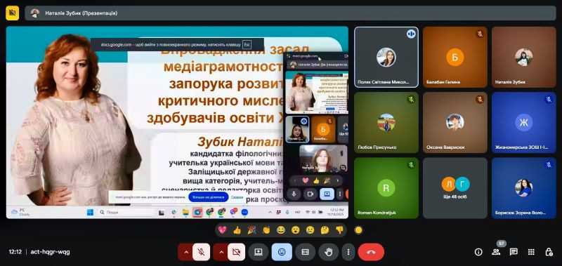 18 листопада 2025 року у Тернопільському обласному комунальному інституті післядипломної педагогічної освіти на платформі сервісу відеоконференцій Google Meat відбувся педагогічний форум «Формування медіаграмотності у сучасному виховному процесі». Захід був проведений для класних керівників ЗЗСО області з метою підвищення обізнаності учасників актуальних питань формування медіаграмотності в умовах сучасних викликів; вироблення ефективних підходів, методів і засобів виховної роботи, спрямованих на розвиток критичного мислення, свідомого сприйняття інформації та формування стійких ціннісних орієнтирів учнів у контексті інформаційної безпеки (модератори – Зоряна Борисюк та Світлана Буняк, методисти центру виховної роботи, захисту прав дитини та громадянської освіти ТОКІППО) .