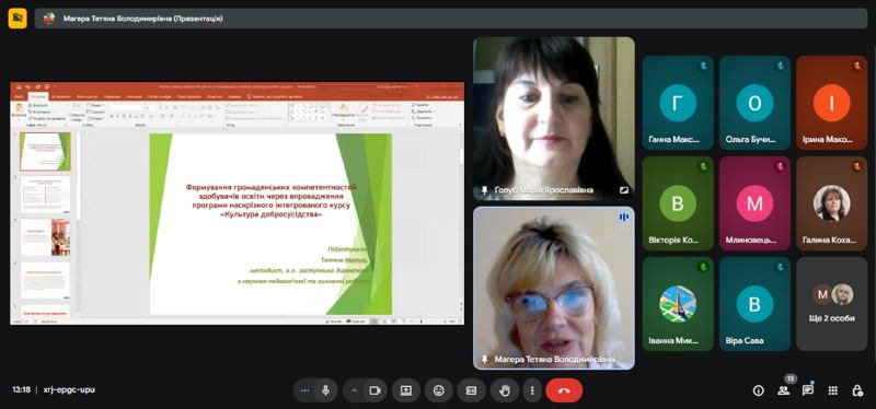 Відповідно до плану роботи інституту 17 вересня 2025 р. в Тернопільському обласному комунальному інституті післядипломної педагогічної освіти на платформі сервісу Google Meet у форматі онлайн проводилась інструктивно-методична нарада з питань впровадження програм інтегрованого наскрізного курсу «Культура добросусідства» для педагогів, що працюють за програмою «Культура добросусідства» та педагогічних працівників закладів загальної середньої освіти області.