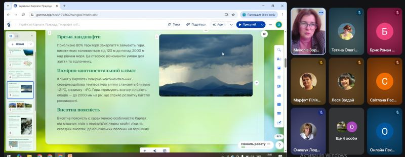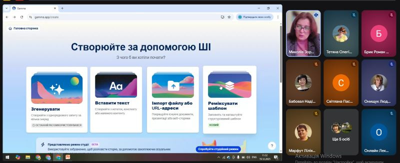 Практичні аспекти впровадження медіаосвітніх інструментів для створення власного контенту висвітлила Миколів З. П., методист, в. о. завідувача лабораторії STEM-освіти ТОКІППО. Зоряна Петрівна детально продемонструвала можливості роботи із сучасними онлайн-ресурсами: Gemini, iColoring AI, Gamma.