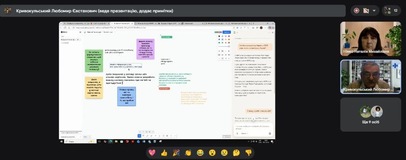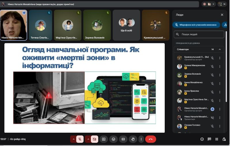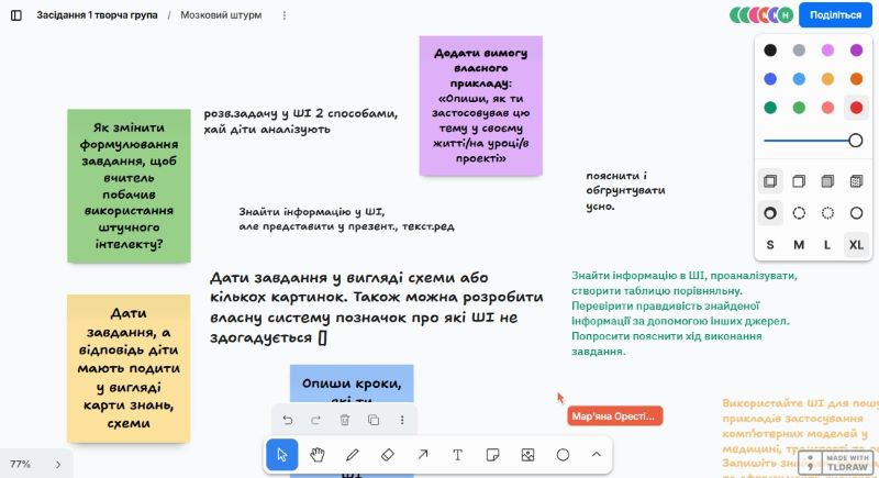 Наталія Німко ознайомила учасників із визначенням «мертва зона» у програмі з інформатики та організувала індивідуальну практичну роботу «Визначення "мертвих зон" програми з інформатики» на дошці tldraw.com та було підведено підсумки такої роботи. Після цього плавно перейшли до мозкового штурму. Під керівництвом Любомира Кривокульського, в.о. центру інформатики, ІКТ та ДО та Наталії Німко вчителі обговорили питання «Як змінити формулювання завдання, щоб вчитель побачив використання штучного інтелекту?».