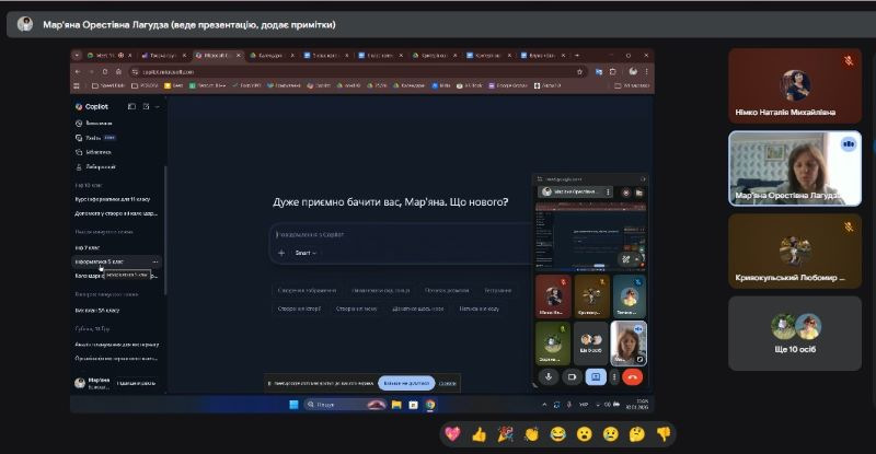 Мар’яна Лагудза, вчитель інформатики Мишковицького ліцею продемонструвала можливості ШІ у шкільній програмі з інформатики, зокрема поділилася досвідом роботи в Copilot, де Ші допомагає розробляти планування, урок, оцінювання та інше.