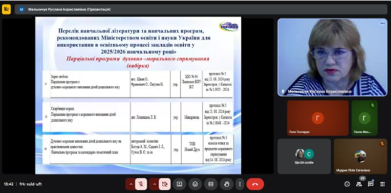 Модератор заходу Руслана Мельничук, методист відділу дошкільної та початкової освіти ТОКІППО, висвітлила тему «Методичні рекомендації щодо організації роботи з духовно-морального виховання в сучасному закладі освіти»», окресливши основні нормативно-правові документи, створення відповідного середовища, принципи та форми роботи з дошкільниками.