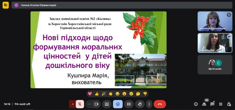 Своїм досвідом роботи з питання «Нові підходи щодо формування моральних цінностей у дітей дошкільного віку» поділились директор Галина Гринюк та вихователь Марія Кушпира із закладу дошкільної освіти №2 «Калина» м.Хоростків Хоростківської міської ради Тернопільської області Хоростківської ТГ. Марія Миколаївна детально представила розробки своїх проєктів, тематичних днів, терапевтичних казок, алгоритм технології «Ситуація морального вибору».