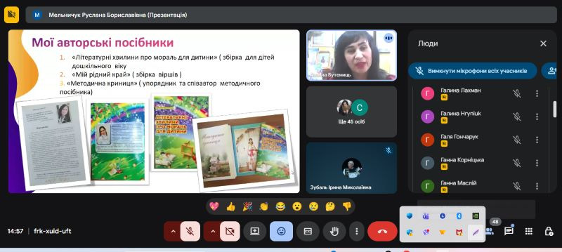 Галина Бутениць, вихователь-методист закладу дошкільної освіти дитячий ясла-садок «Дивосвіт» с.Мишковичі Великоберезовицької селищної ради тернопільської області Великоберезовицької ТГ, яскраво презентувала свої авторські видання (посібник для дошкільної спільноти «Методична криниця» і дитячу збірку поезій «Літературні хвилини про мораль для дитини»), авторські розробки дидактичних ігор та сценарії свят для дітей різних вікових категорій. Галина Володимирівна детально розкрила тему, над якою вона працює багато років «Художня література як засіб морально-естетичного виховання дітей дошкільного віку».