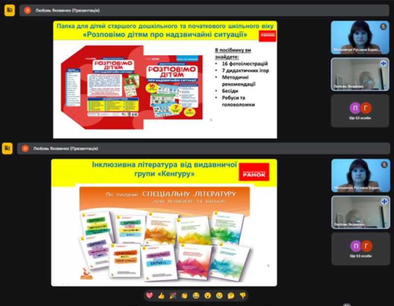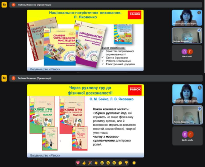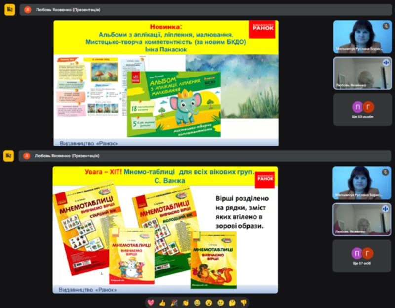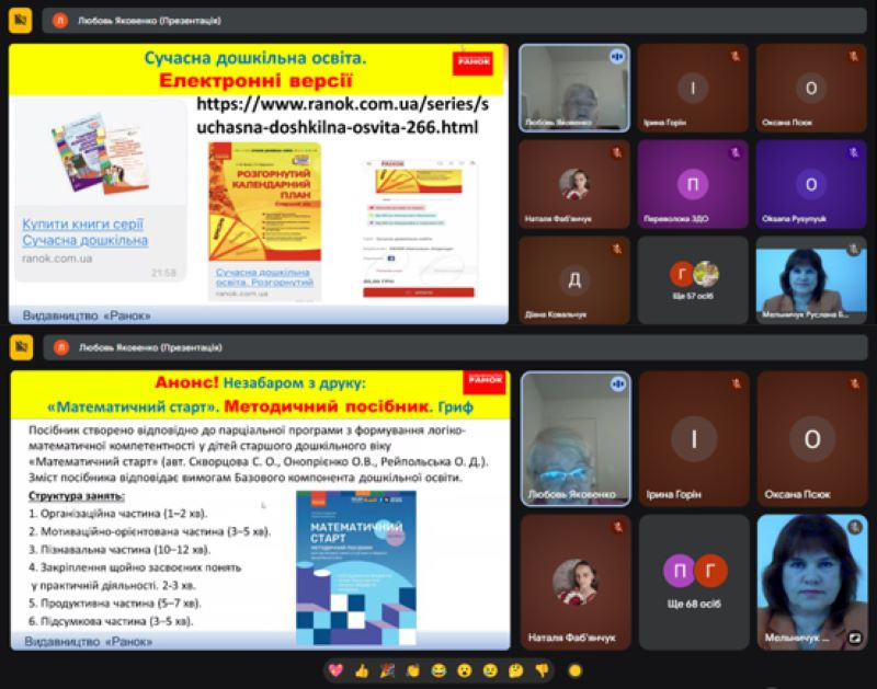 Яковенко Любов Василівна, промоутер-методист видавництва «Ранок», автор методичних посібників для дошкілля, дитяча письменниця, лауреатка Міжнародних літературних конкурсів та звання «Золоті письменники України», яскраво розкрила свою тему «Новинки та хіти дошкільного сектору видавництва «Ранок» і їх можливості у формуванні освітніх компетентностей у дошкільнят», докладно інформуючи учасників обласного вебінару про особливості різних навчально-методичних комплектів, посібників, збірників видавництва віповідно до освітніх напрямів дошкільної освіти та поділилась своїми авторськими надбаннями.