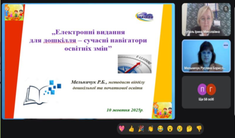 10 жовтня 2025 року на платформі сервісу відеоконференцій Google Meet Тернопільського ОКІППО проведено вебінар на тему «Творча зустріч з автором посібників для педагогів дошкільної освіти видавництва «Ранок» Яковенко Л.В.». Метою заходу було забезпечення прямого діалогу між автором та педагогами дошкільної освіти, надання методичних порад, підходів до навчання дошкільників, які грунтуються на матеріалах авторських доробків; удосконалення вміння використовувати в освітньому процесі електронні видання та платформи. Для участі були запрошені педагогічні працівники закладів дошкільної освіти Тернопільської області.