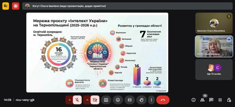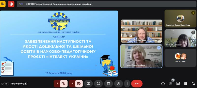17 березня 2026 року в онлайн-форматі відбувся обласний семінар, присвячений актуальним питанням забезпечення наступності та якості освіти в межах науково-педагогічного проєкту «Інтелект України». Захід об’єднав представників центрів професійного розвитку педагогічних працівників, керівників та педагогів закладів дошкільної та загальної середньої освіти Тернопільської області.